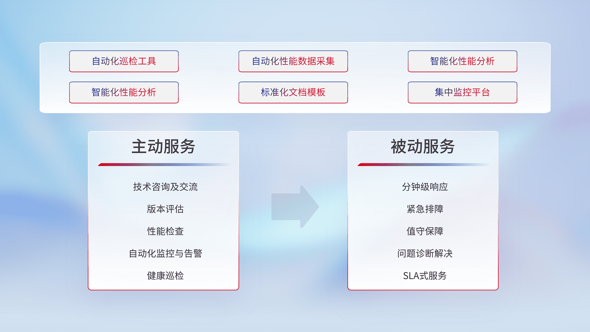 智能化工具和标准化文档,,,保障服务质量,,提供主动服务(包含技术咨询、、、、版本评估、、、、性能检查、、自动化监控与告警、、、健康巡检)和被动服务包含(分钟级响应、、紧急排障、、、、值守保障、、、、问题诊断解决、、SLA服务)。。。
