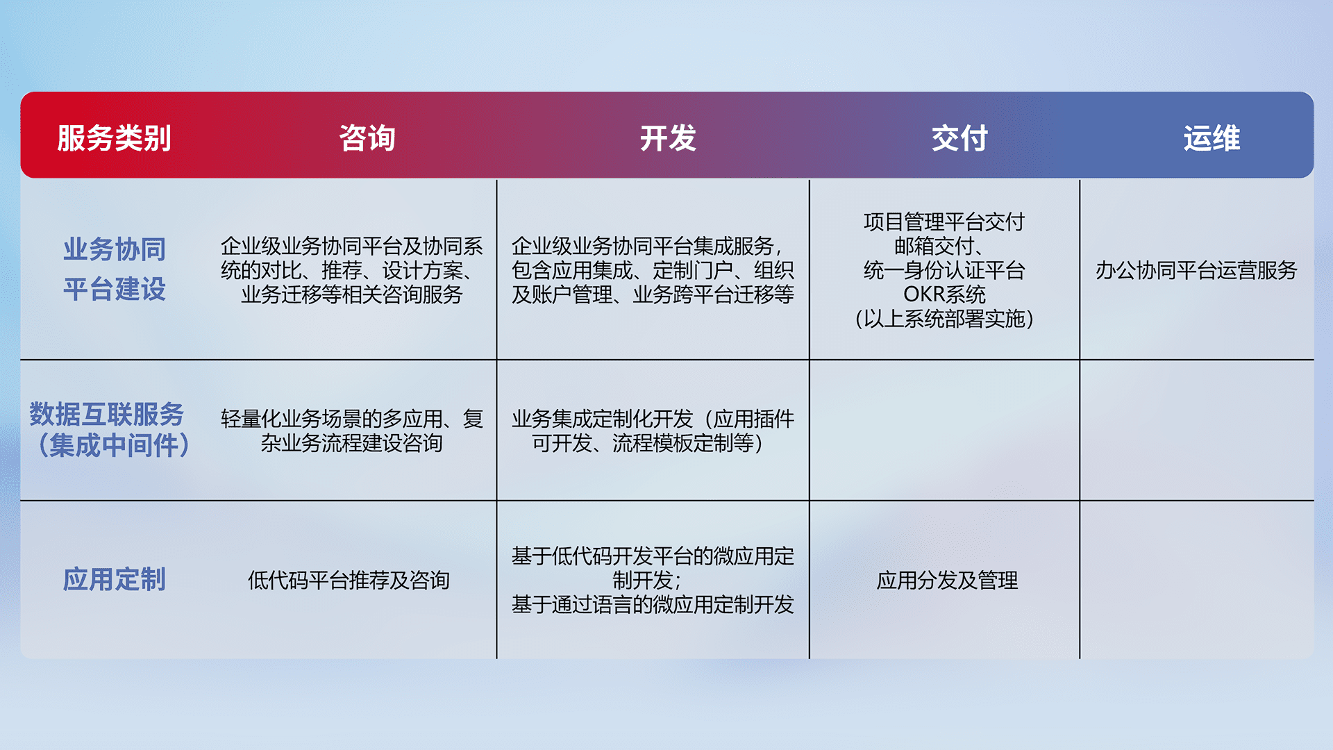针对钉钉、、企微、、、、IDaas等平台级产品提供产品的规划、、方案、、、交付、、、定制化开发等服务,,,,实现如统一协同办公、、、、智能客户服务、、、混合会议管理、、智能数据查询、、、等业务场景,,,,实现数字化转型。。